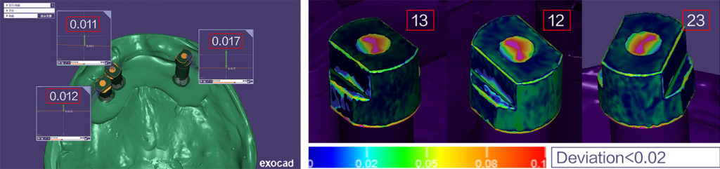 Match the design in exocad. Based on the color bar, the matching error here is less than 0.02mm.