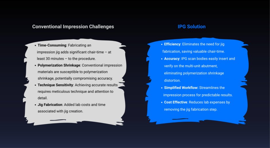 Concerns about the accuracy of intraoral scanners (iOS) for full-arch scans are valid. However, the IPG system is specifically designed to mitigate these concerns through: