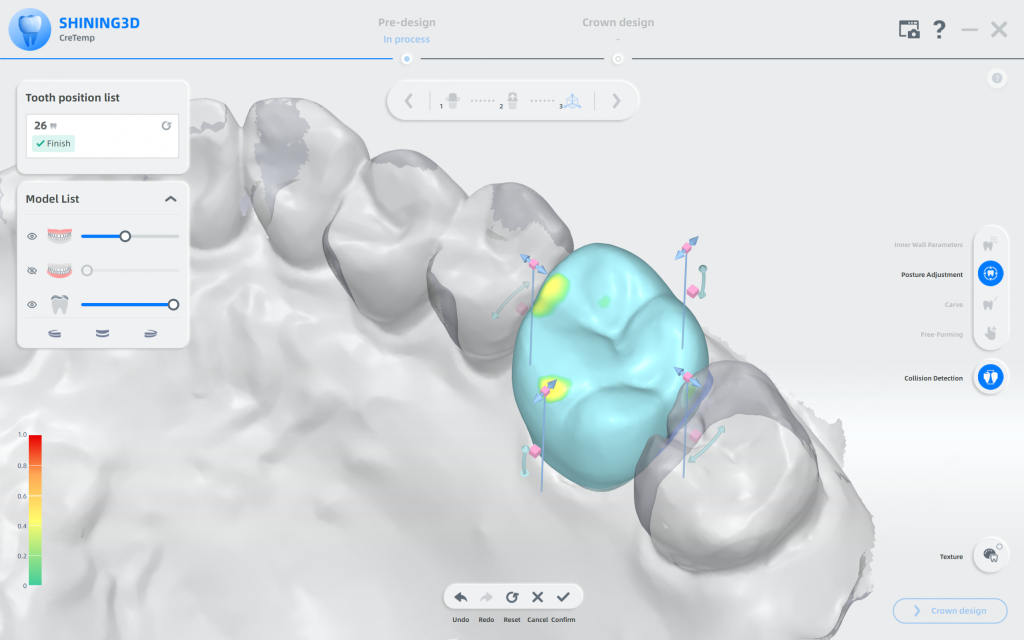 New CreTemp refines design parameters and supports flexible free-forming adjustment, with added tools such as collision detection and adaptive adjustment to optimize occlusal contacts and proximal fit.