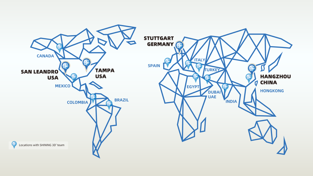 SHINING 3D has expanded the reach beyond the domestic market, establishing a global presence with subsidiaries in Stuttgart, Germany; California and Florida, USA; and Tokyo, Japan. We also have local service teams in over 11 other countries. Operating under international quality standards and providing localized services, we support users in over 100 countries and regions, offering fast and comprehensive support in 12 languages.